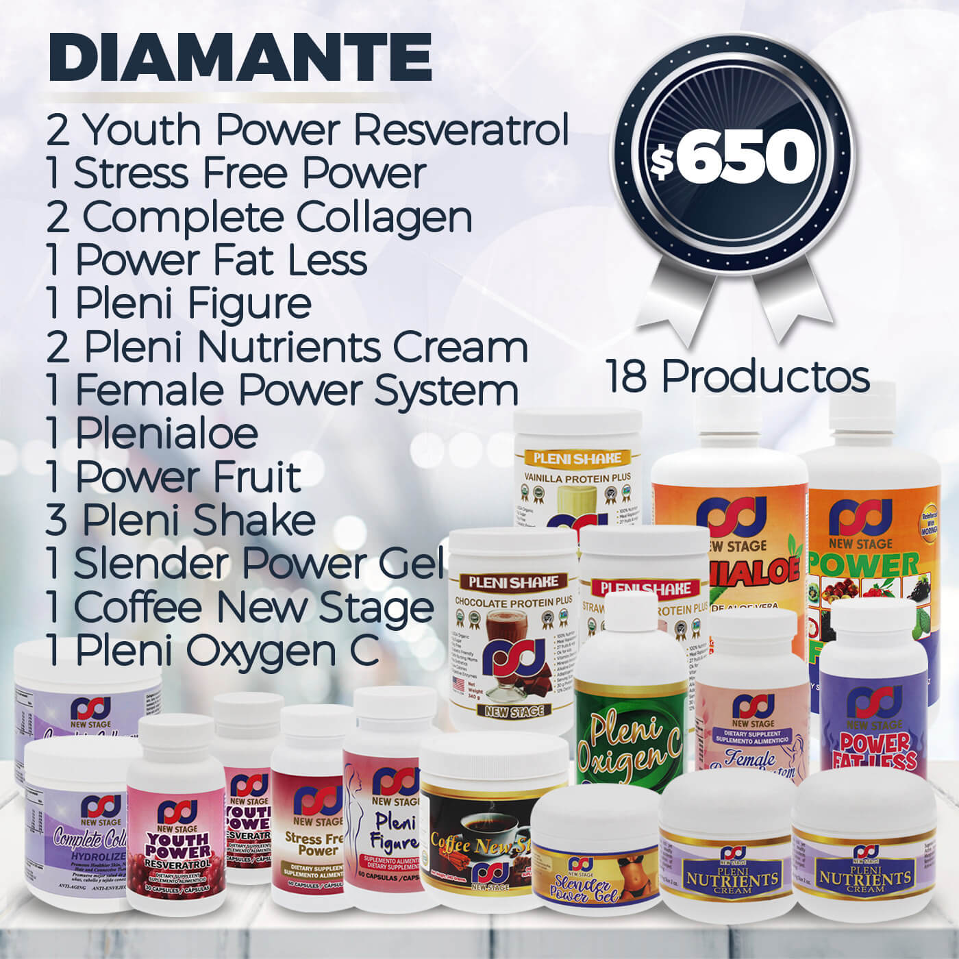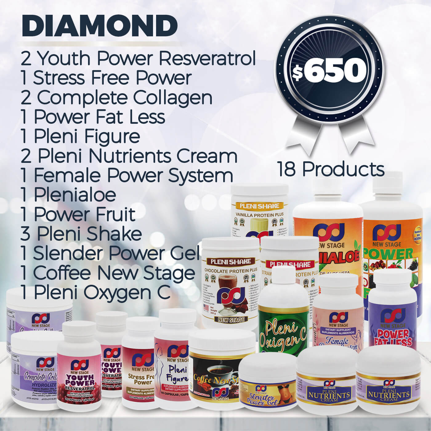 Al unirse como Diamante, recibirá un paquete inicial que contiene dieciocho [18] artículos, que incluye al menos uno de casi todos los productos de nuestro catálogo. ¡Ser un New Stage Diamond es la mejor opción para mejorar tu vida al siguiente nivel!